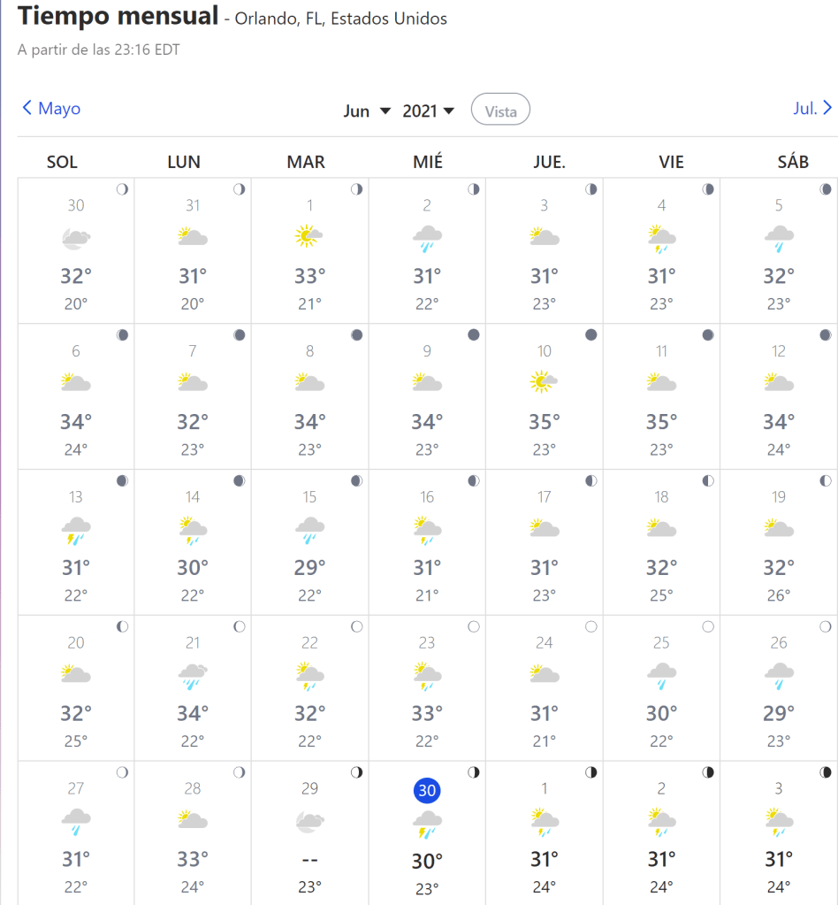 - La pagina de weather.com es básica. Puedes revisar el pronóstico del día, semana, mes, incluso por horas. Revisa la temperatura máxima y mínima durante el día para ver si deberás llevar capas de ropa o abrigos.