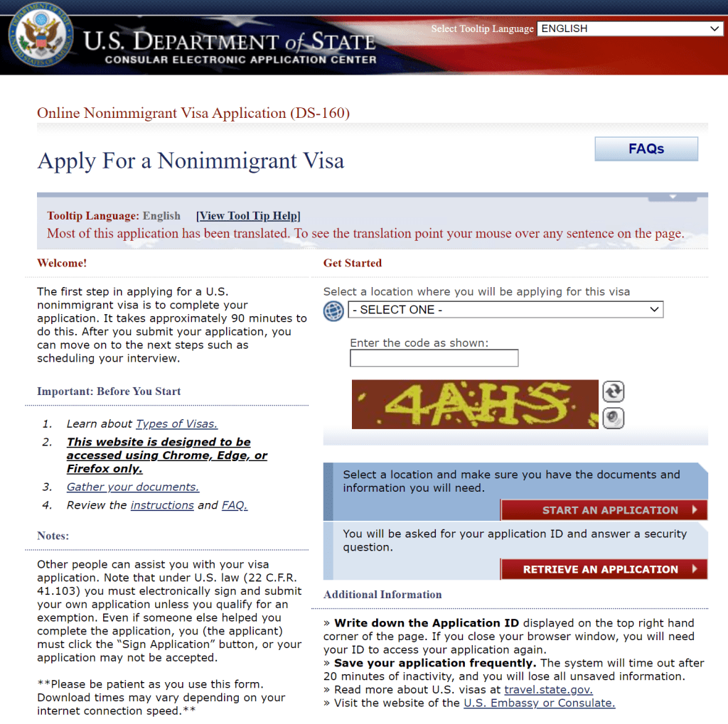 - Llenar un formulario en el sitio web americano de Visas, llamado DS-160. Tu formulario tendrá un numero de identificación con el que harás todo el proceso, siempre tenlo a la mano. Es de 10 dígitos (letras y números). https://ceac.state.gov/genniv/