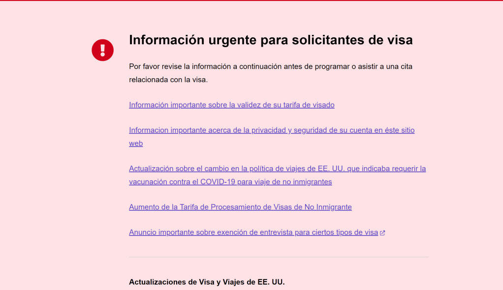 - Cuando entres a esta pagina https://ais.usvisa-info.com/es-pe/niv scrollea hacia abajo ya que en el momento que hice el proceso había un «pop up» rosado que parecía que te enviaba a un link roto.