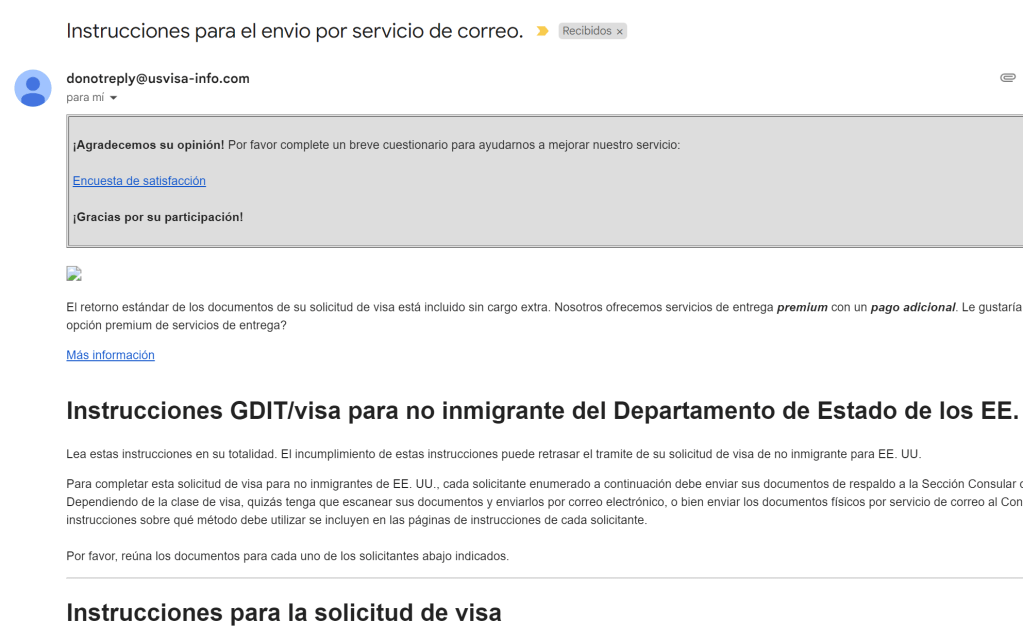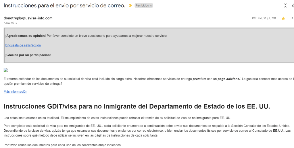 Luego llego este correo. Lo ignore porque decía «INSTRUCCIONES PARA EL ENVIO POR SERVICIO DE CORREO» pero ya podía dejar mis documentos!