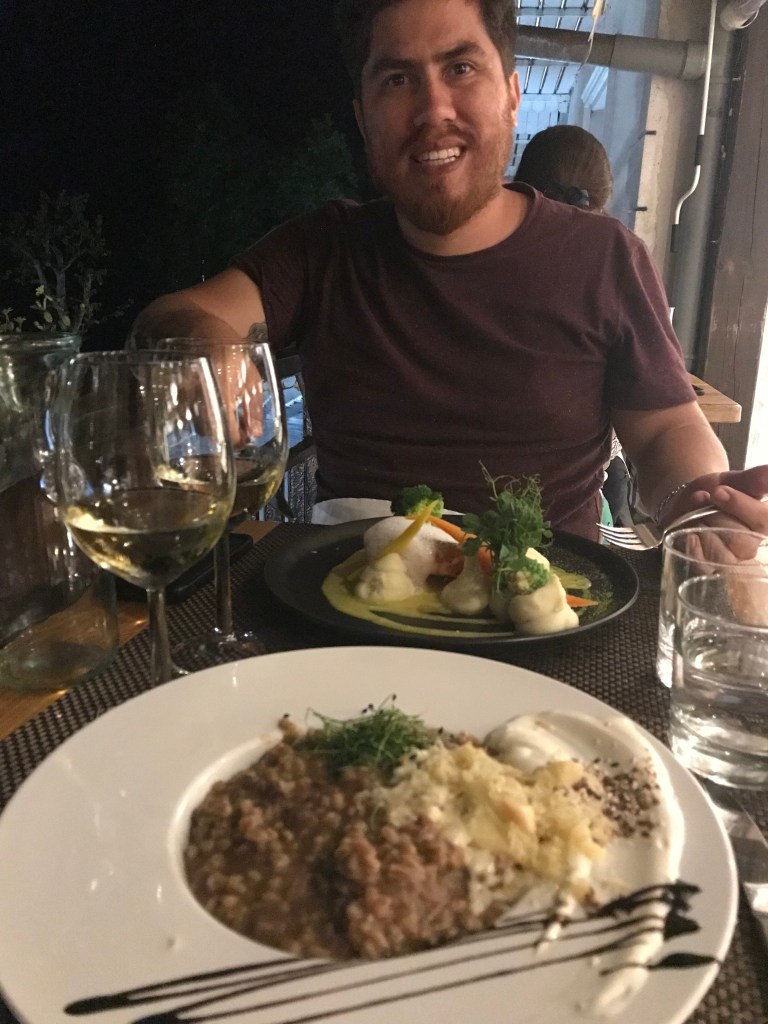 ¿Cena gourmet con vista al lago? $$ El restaurante Sova tiene lindo ambiente y comida europea. Puedes comer dentro o desde el balcón del segundo piso. Elegimos rissotto y pescado.